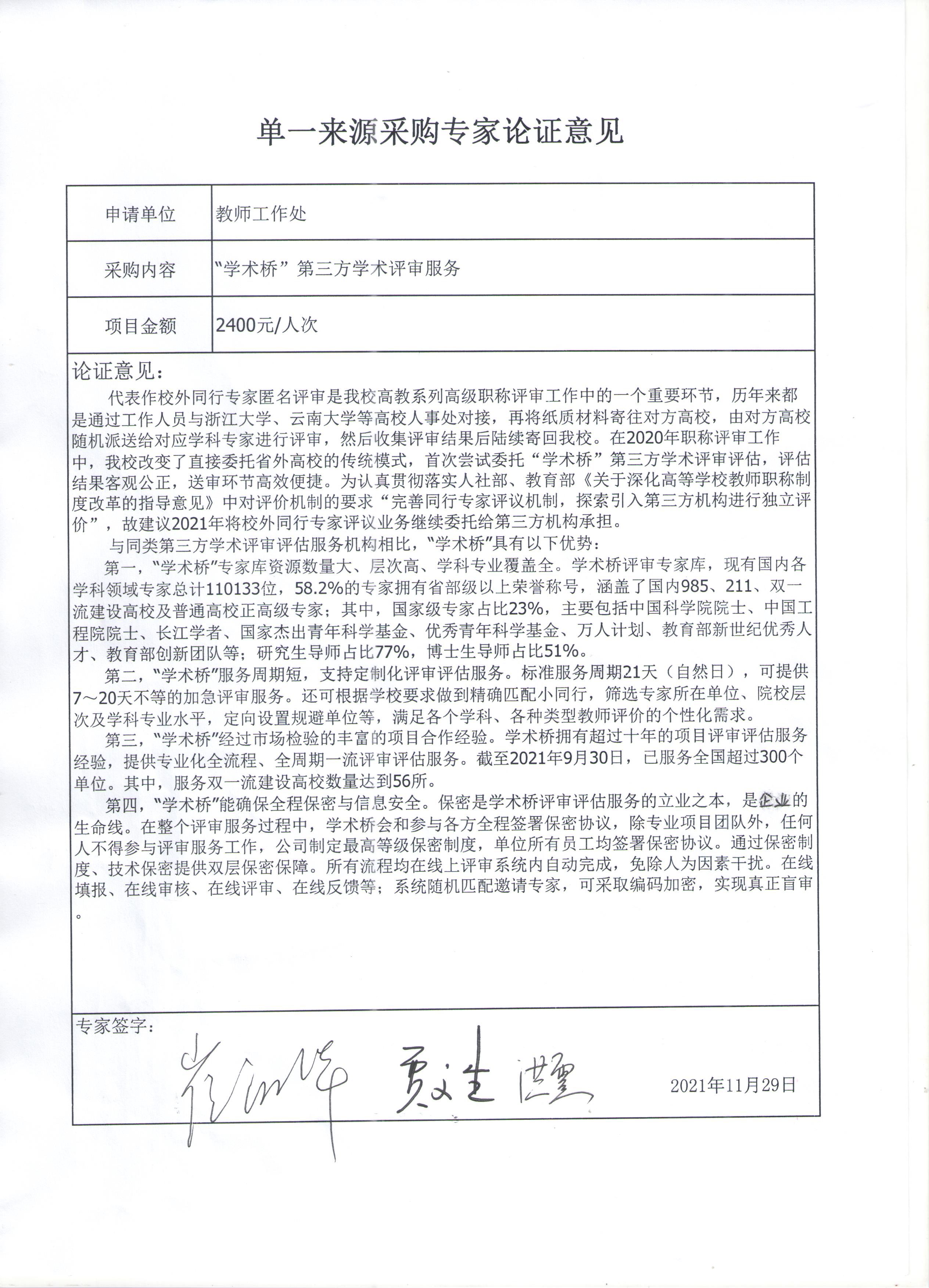 一、项目信息1.采购人:必赢bwin线路检测中心教师工作处2.项目编号:GDZB-CG-DY-2021-143.项目名称:必赢bwin线路检测中心教师工作处学术评审评估服务项目4.采购主要内容:采购必赢bwin线路检测中心学术评审评估服务。5.拟采购的服务数量:1批6.拟采购服务的预审金额:480000.00(元)7.采用单一来源采购方式的原因及说明:鉴于学术桥(北京)教育科技有限公司一是专家库资源数量大、层次高、学科专业覆盖全,二是服务周期短,支持定制化评审评估服务,三是经过市场检验的丰富的项目合作经验,四是能确保全程保密与信息安全。根据相关法规及政策规定,结合本项目需求,建议采用单一来源方式采购,并向“学术桥(北京)教育科技有限公司”采购。二、拟定供应商信息名称:学术桥(北京)教育科技有限公司三、公示期限时间:2021-12-3至2021-12-08(公示发布之日起不得少于3个工作日)四、其他补充事宜专业人员论证意见:见附件专业人员情况(姓名、工作单位和职称):崔海洋(必赢bwin线路检测中心,教授)贾文生(必赢bwin线路检测中心,教授)洪云(必赢bwin线路检测中心,教授)五、联系方式1.采购人信息联系 人: 陈思民地址:贵阳市花溪区必赢bwin线路检测中心西校区德正楼318联系方式:1