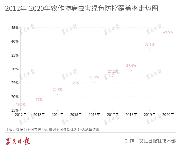 目前,全国农作物病虫害绿色防控覆盖率已从2012年的15.2%提升至2020年的41.5%,重点区域果菜茶绿色防控基本实现全覆盖。