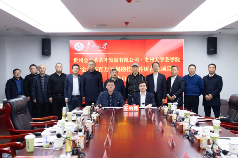 在与会人员的共同见证下,双方签署校企合作协议。合作内容涵盖无咖啡碱茶饮料应用、安顺烘青茶工艺、安顺茶园管护示范等内容,双方将共同开展茶科技研发、人才培养、科研成果转化等方面的深度合作,助推茶产业高质量发展。贵州省茶文化研究会,贵州省绿茶品牌发展促进会,我校教务处、对外合作处、科学技术研究院、生命科学学院、茶学院,贵州金尘茶茶叶发展有限公司董事长等单位有关负责人,茶学院师生代表参加签约仪式。