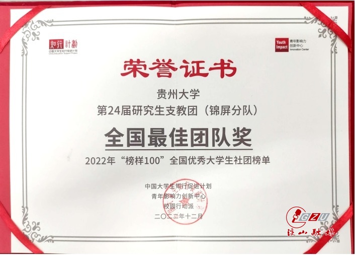 Recently, the “Top 100 Model” List of Exemplary University Student Associations 2022 was released. Guizhou University’s 24th Graduate Student Volunteer Teaching Team (Jinping Branch) was honored with the “National Best Team Award”.