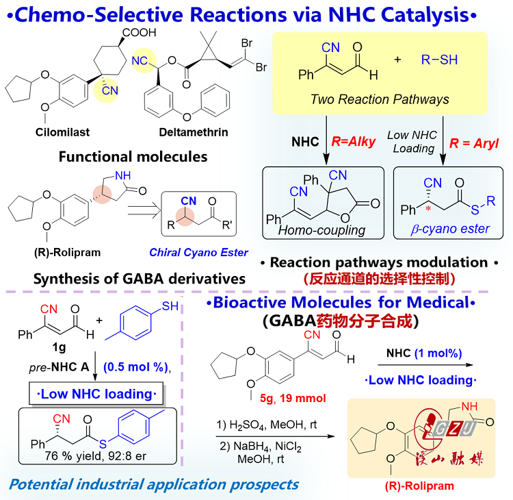 Under the collaborative guidance of Professor Chi Yonggui and Professor Zheng Pengcheng, a team comprising Master's student Fan Guodong and Doctoral student Wang Qingyun, among others, has published a paper titled "Carbene-catalyzed chemoselective reaction of unsymmetric enedials for access to Furo[2,3-b]pyrroles." Additionally, Doctoral students Wang Qingyun and Wu Shuquan, together with their team, have contributed the paper "NHC-catalyzed enantioselective access to β-cyano carboxylic esters via in situ substrate alternation and release," revolving around the utilization of nitrogen heterocyclic carbene (NHC) as a pivotal biomimetic catalyst. This approach enables the precise manipulation of reaction sites and pathways by regulating various forms of chemoselectivity, ultimately facilitating the creation of chiral non-natural amino acids and furan-pyrrole type active compounds used in pharmaceuticals and pesticides.