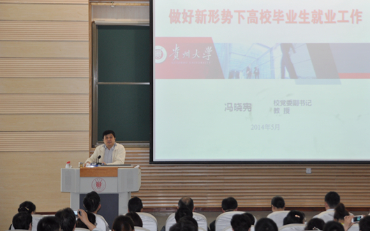 贵大新闻网讯(招生就业处)5月22日下午,我校2014届毕业生就业工作推进会在西校区圆形报告厅举行。校党委副书记冯晓宪出席并做专题讲座,各学院(研究中心、实验室)党委副书记、负责毕业生就业工作的老师、招生就业处全体成员和近300名学生代表参加。推进会由招生就业处处长惠淑林主持。 冯晓宪作题为《做好新形势下高校毕业生就业工作》的专题讲座。他简要回顾了我校2013年就业工作的成