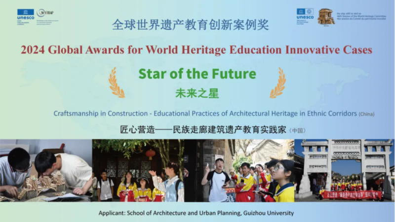 On the afternoon of July 23, local time, the 46th World Heritage Conference themed “Science, Creativity, and Empowerment—World Heritage Education Towards the Future” convened at Bharat Mandapam in New Delhi. During this significant event, the recipients of the Global Awards for Heritage Education Innovation Cases (AWHEIC) were announced. Among the myriad of compelling entries, the project titled “Craftsmanship in Construction—Educational Practices of Architectural Heritage in Ethnic Corridors” led by Dai Fuhong from the College of Architecture and Urban Planning of GZU, alongside her student, Wei Yu, stood out among numerous entries, earning the 2024 “Global Awards for World Heritage Education Innovation Cases - Star of the Future Award”. This achievement marks a significant milestone as it represents the first time our province has received such an honor.